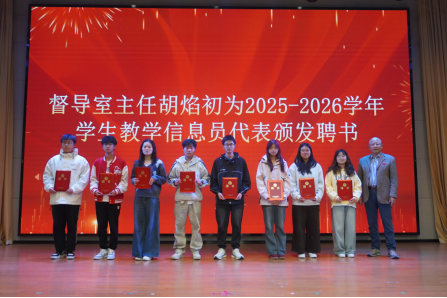 会上,副校长向巍为2024-2025学年优秀学生教学信息员代表颁发奖状,督导室主任胡焰初为2025-2026学年学生教学信息员代表颁发聘书。一批批优秀学子依次上台,接过荣誉与责任,展现出晴川学子积极投身校园治理、服务教学发展的精神风貌。